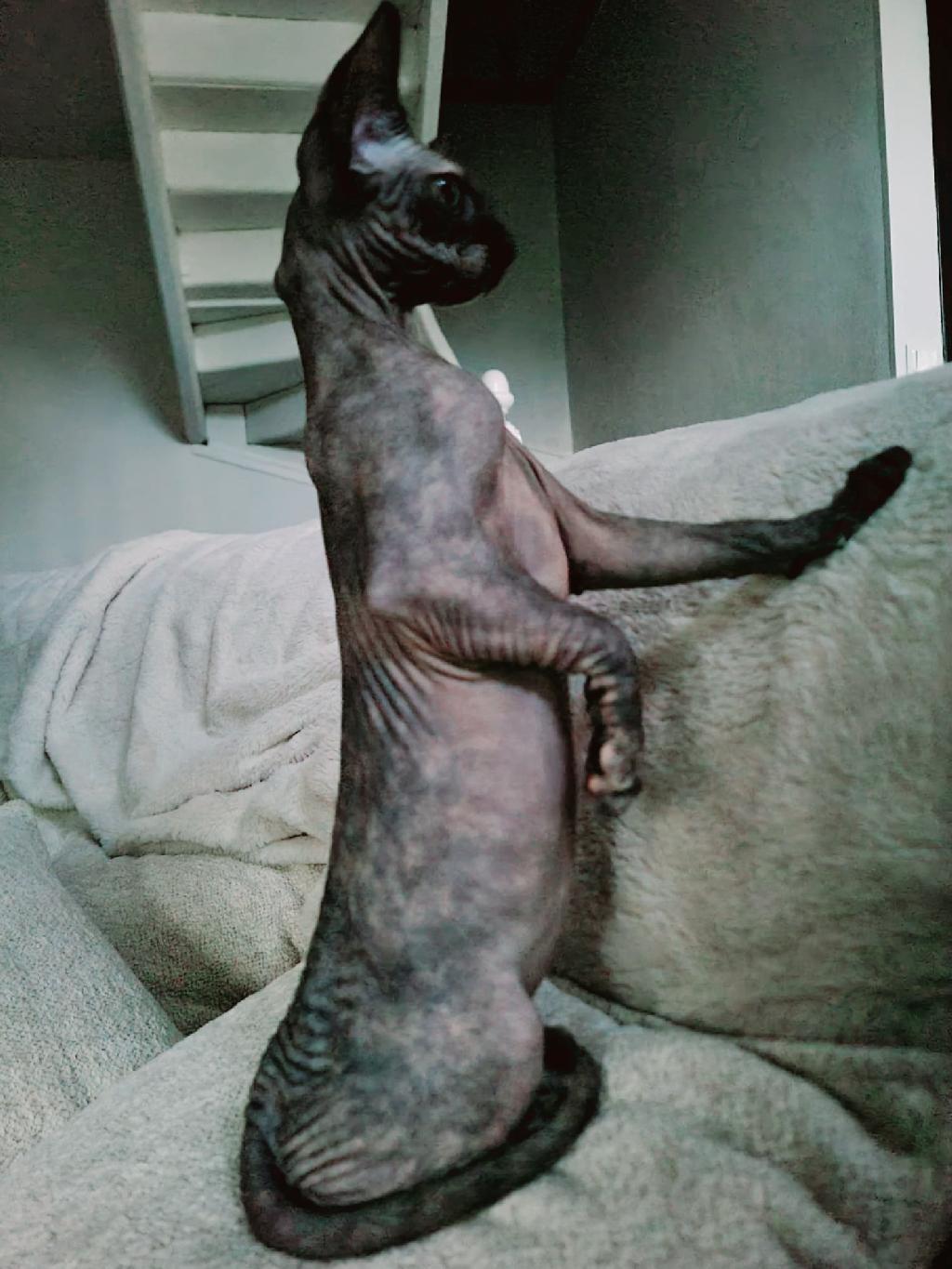 C'est une race originaire du Canada dépourvue de poils avec de grands yeux ronds expressifs, des pommettes rehaussées et de grandes oreilles.